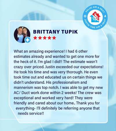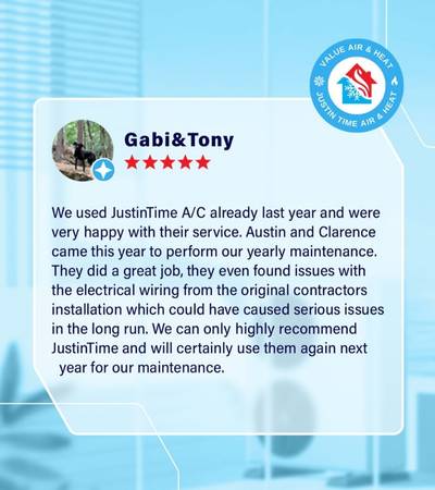 Posted on Kaia HulseTrustindex verifies that the original source of the review is Google. Had David and Justin come and install a new AC system at my place and he did a great job. Super friendly, showed up on time, the install was quick and the new system is running smoothly. If you need ac work done i highly recommendedPosted on Aaron EddingtonTrustindex verifies that the original source of the review is Google. They work fast and efficiently! Great guysPosted on Justin PingTrustindex verifies that the original source of the review is Google. David and the crew did an amazing job replacing our AC at our property. Very kind and respectful. Highly recommend!Posted on Eric EddingtonTrustindex verifies that the original source of the review is Google. Excellent work, very quick and clean. Techs are very friendly!Posted on Ashley PeaseTrustindex verifies that the original source of the review is Google. Very thankful for the work done today! Very friendly and professional!Posted on Paul RandallTrustindex verifies that the original source of the review is Google. I was recommended to contact Justin from a good friend. I needed a second opinion on replacing two AC units. Joey came out. Serviced both units and concluded that both units were in great condition with no leaks. This was completely different from the maintenance information I received from BelAire, who informed me of low pressure due to leaks which created an issue with significant mold and recommending an immediate replacement of both units. Joey was amazing and honest. No new units are necessary, no leaks. Thanks Justin for sending Joey to my house.Posted on Lisa McFarlandTrustindex verifies that the original source of the review is Google. We have been customers of Justin and have always been very impressed with his service. From booking the service call to the actual appointment, Justin is very customer oriented , thorough in his approach and delivers every time. Thank you Justin for the annual servicing of the air conditioner that you installed!Posted on JTrustindex verifies that the original source of the review is Google. Very informative, very professional! Would recommended to anyone!Posted on james creminsTrustindex verifies that the original source of the review is Google. Ryan and his crew were very courteous, and professional, and helped me get the thermostat programed Joey was a fantastic sales representative who set this holding up. Very happy with the company.Verified by TrustindexTrustindex verified badge is the Universal Symbol of Trust. Only the greatest companies can get the verified badge who has a review score above 4.5, based on customer reviews over the past 12 months. Read more